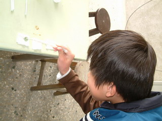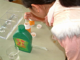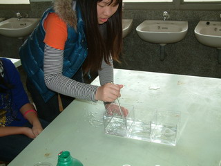 加入洗劑:第一個燒杯放入30ml的水,第二個燒杯放入30ml稀釋的洗衣精,第三個燒杯放入滴入30ml的無患子萃取液,用玻璃棒攪動十圈,再放在手心搓洗二十次。