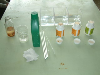 加入洗劑:第一個燒杯放入30ml的水,第二個燒杯放入30ml洗衣精,第三個燒杯放入滴入30ml的無患子萃取液,用玻璃棒攪動十圈,再放在手心搓洗二十次。