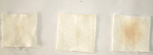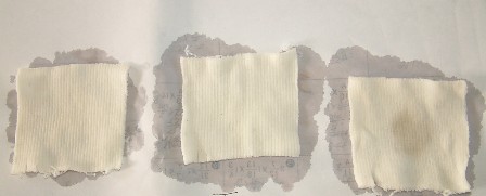 在布上滴入黑芝麻油:在三塊布的正中央各滴0.5ml黑芝麻油,並將布各放入三杯燒杯中。
